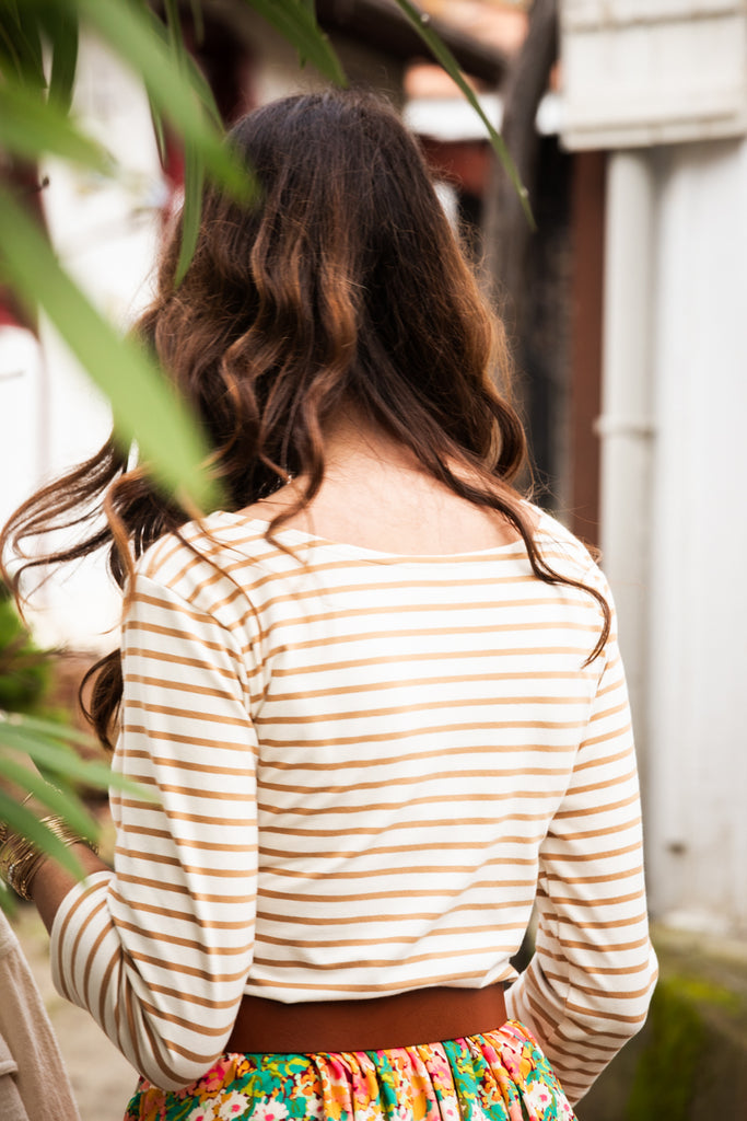 Ses rayures beiges et camel réchauffent vos tenues et sont parfaitement assorties à nos pantalons Clément. Elles pourront aussi facilement se porter avec vos jeans et jupes préférés et pourquoi par en mix and match d'imprimés comme avec notre jupe Livia cosmos sur ces photos.
