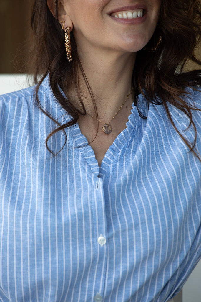 La robe Axelle est une robe Chemise, droite, pleine de petits détails : une encolure V soulignée de petits volants, des poignets de manches travaillés en arrondis, de jols bouton nacrés et un empiècement froncé dans le dos.