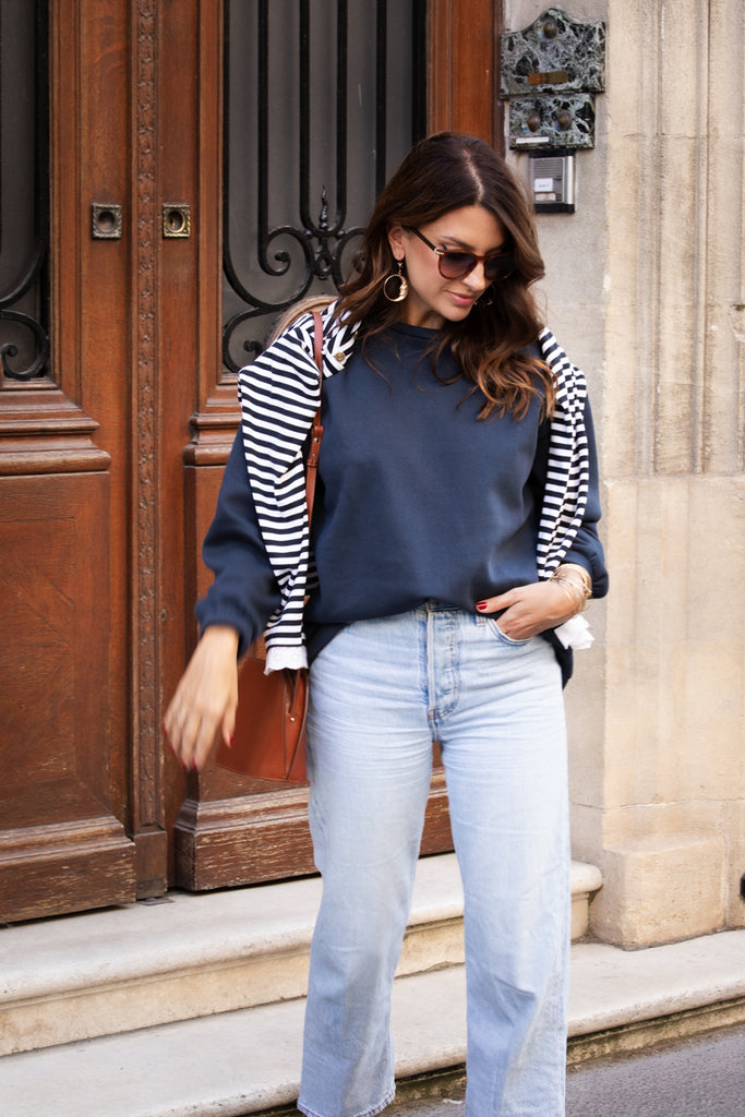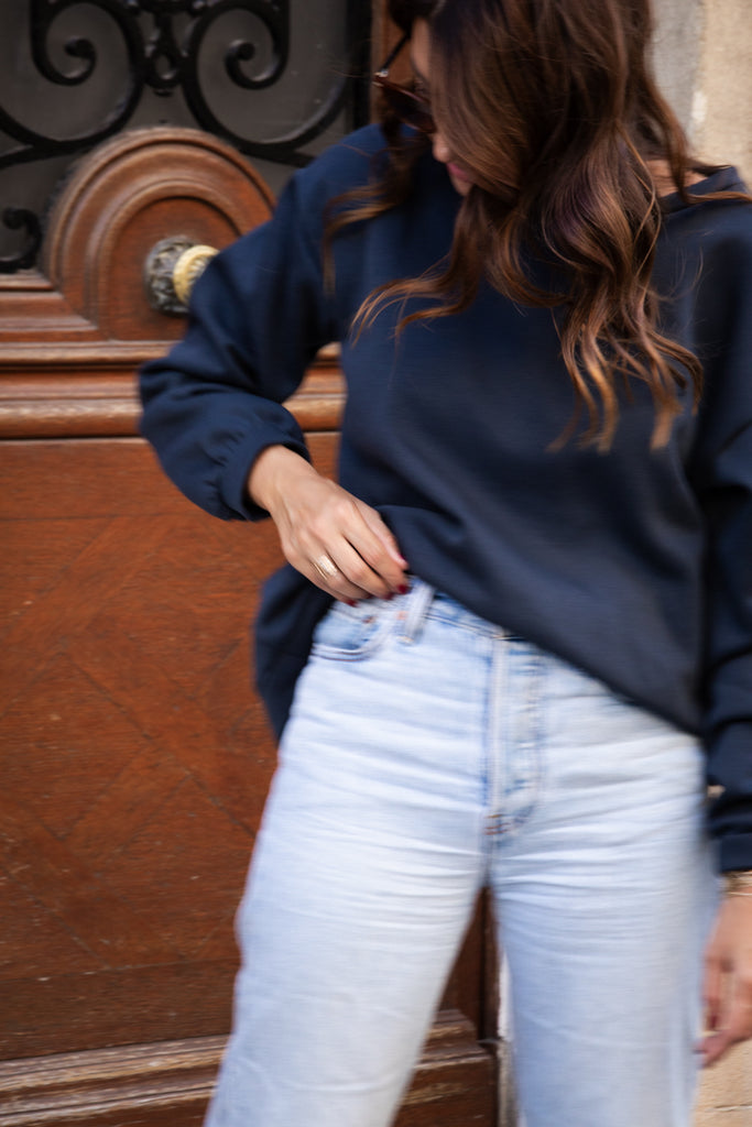 Taille : Le sweat Tony taille normalement. Prenez votre taille habituelle. Pour un rendu plus loose comme sur les photos, prenez la taille au dessus (Maud, notre mannequin, porte la taille M pour son 36/38)